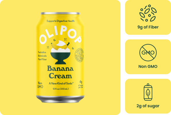 Ingredients: Carbonated Water, OLISMART (Cassava Root Fiber, Chicory Root Inulin, Jerusalem Artichoke Inulin, Nopal Cactus*, Marshmallow Root*, Calendula Flower*, Kudzu Root*), Banana Puree, Cassava Root Syrup, Lemon Juice, Double-Fold Vanilla*, Stevia Leaf*, Himalayan Pink Salt, Natural Vanilla Flavor, Natural Banana Cream Flavor *Extract